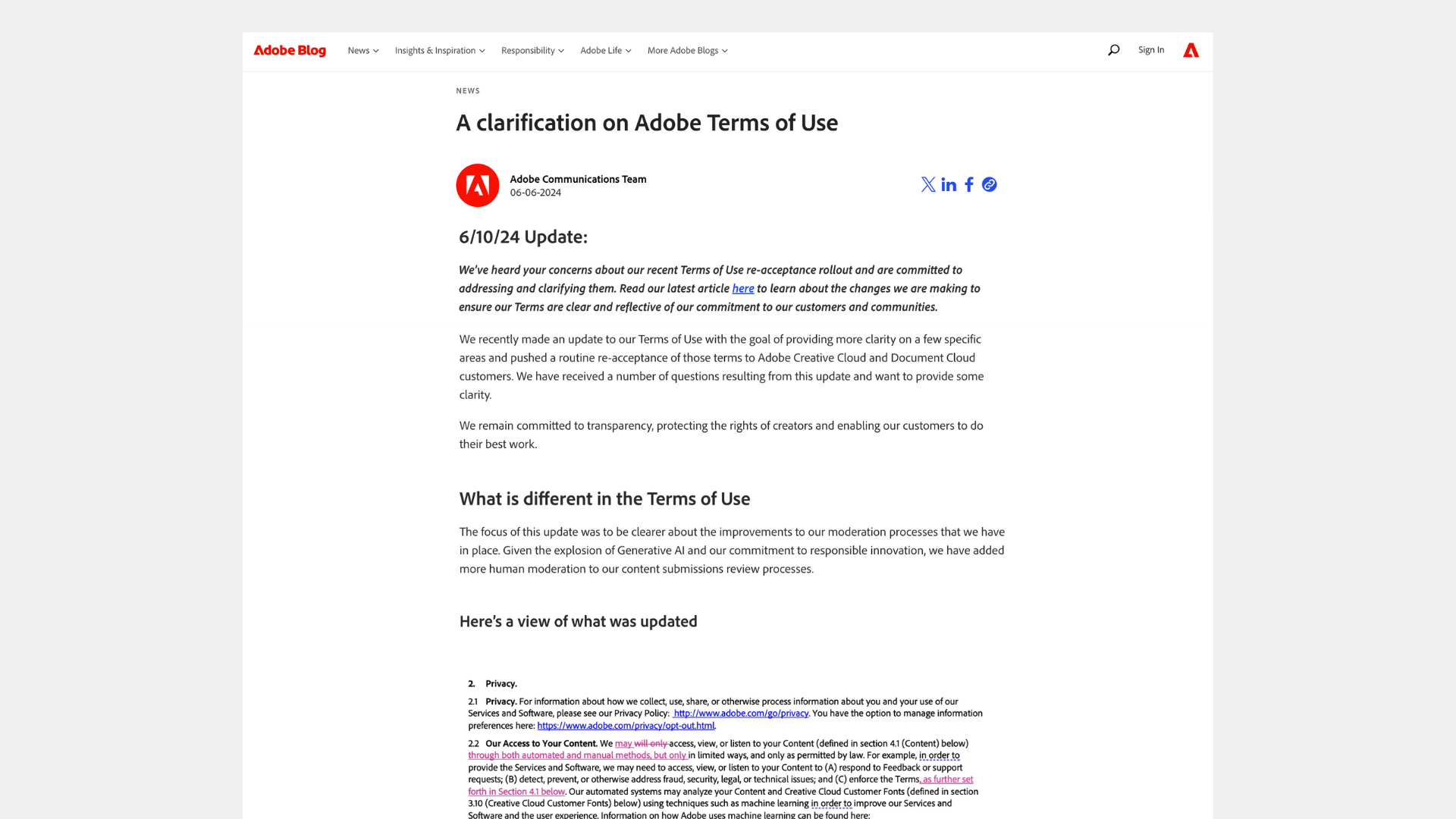 In Adobe’s case, the updated terms lacked the structure, transparency and clarity, that could have prevented panic all over the internet. The irony is that the backlash also gave Adobe an opportunity: To restate its commitments, to clarify its terms language, and to demonstrate transparency by acknowledging mistakes.