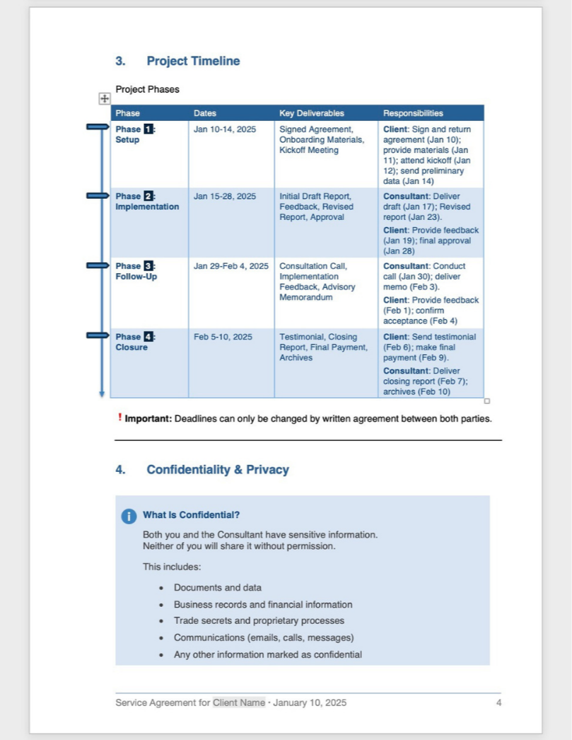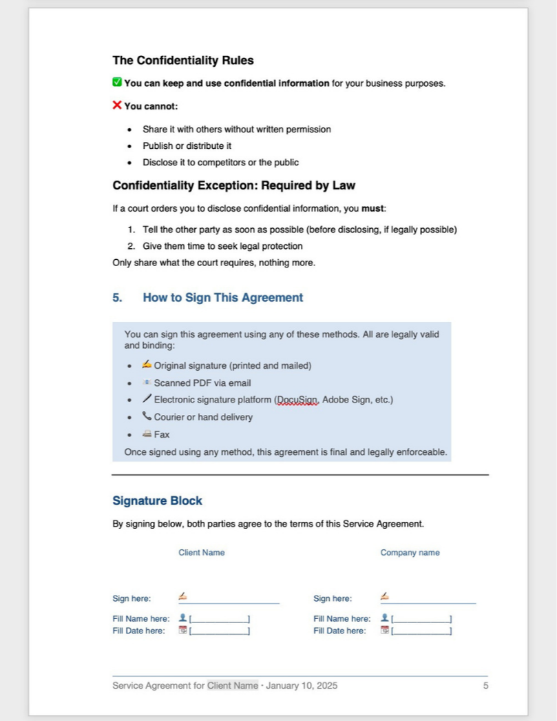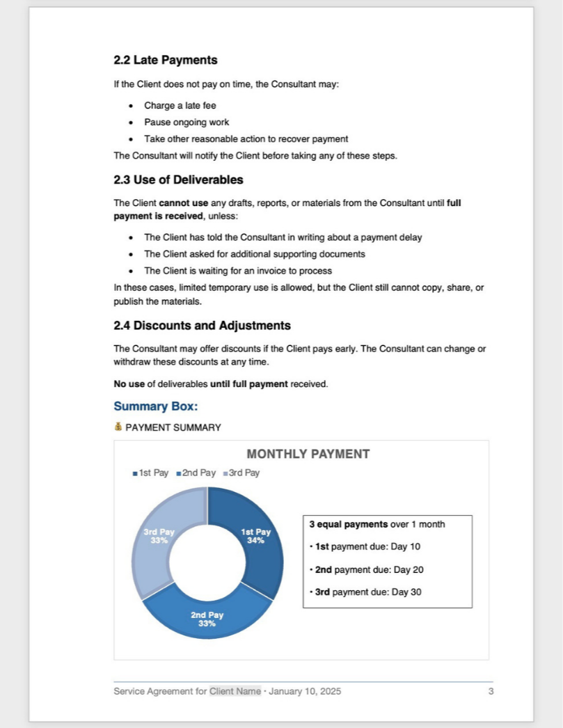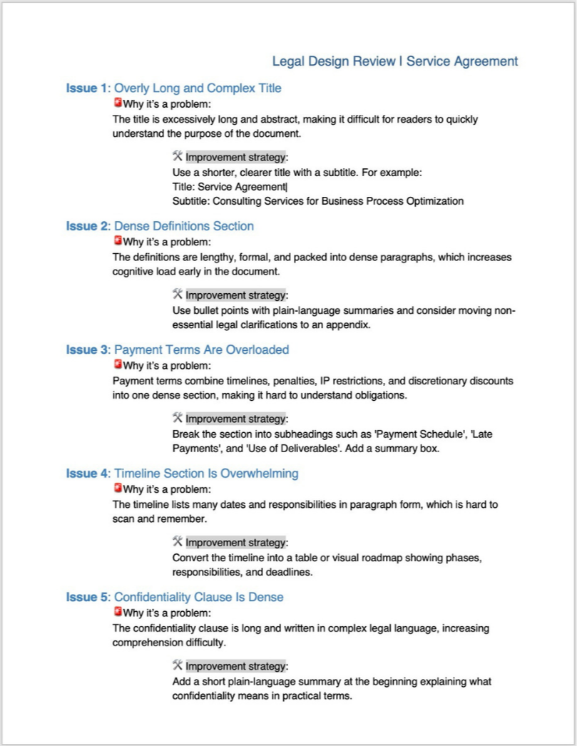The Result: She replaced overloaded payment terms with a clean "Payment Summary Box" and used plain-language summaries to make confidentiality clauses actionable. Â